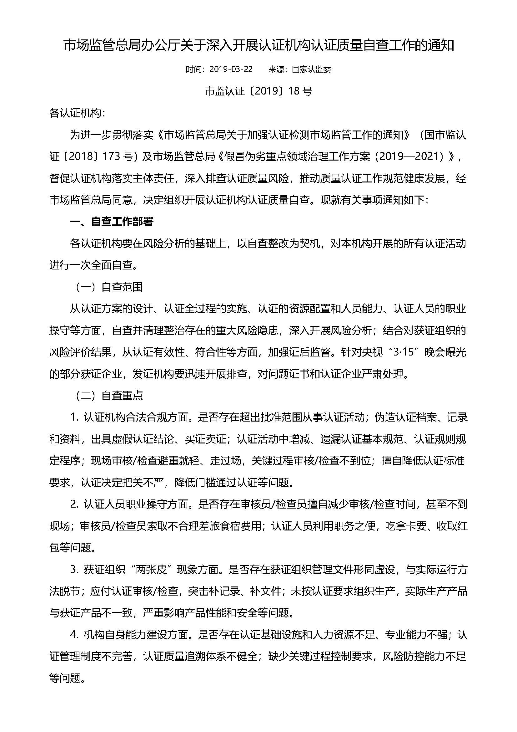 市場監(jiān)管總局辦公廳關(guān)于深入開展認(rèn)證機(jī)構(gòu)認(rèn)證質(zhì)量自查工作的通知-市監(jiān)認(rèn)證2019-18號發(fā)表時(shí)間:2019年05月23日