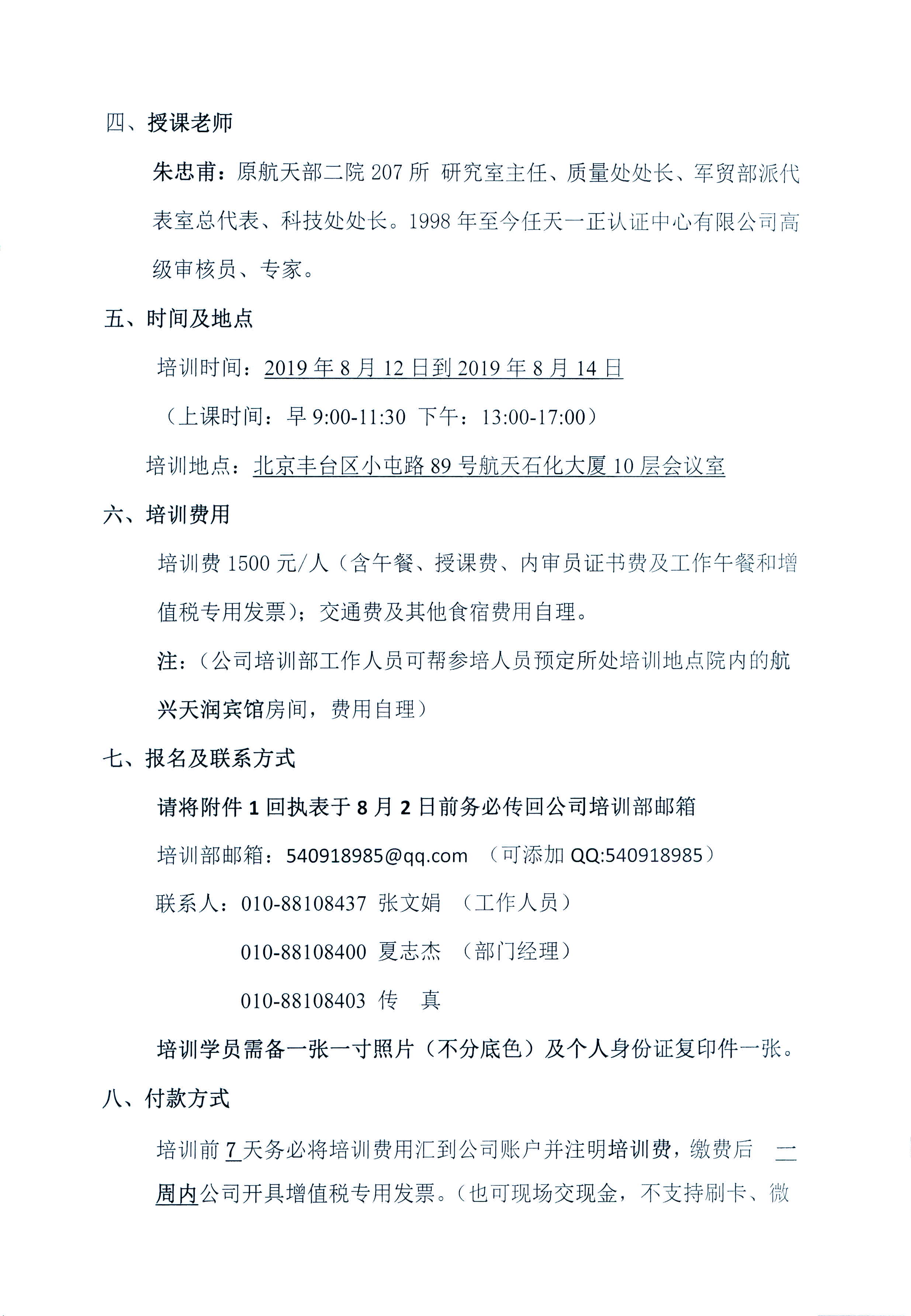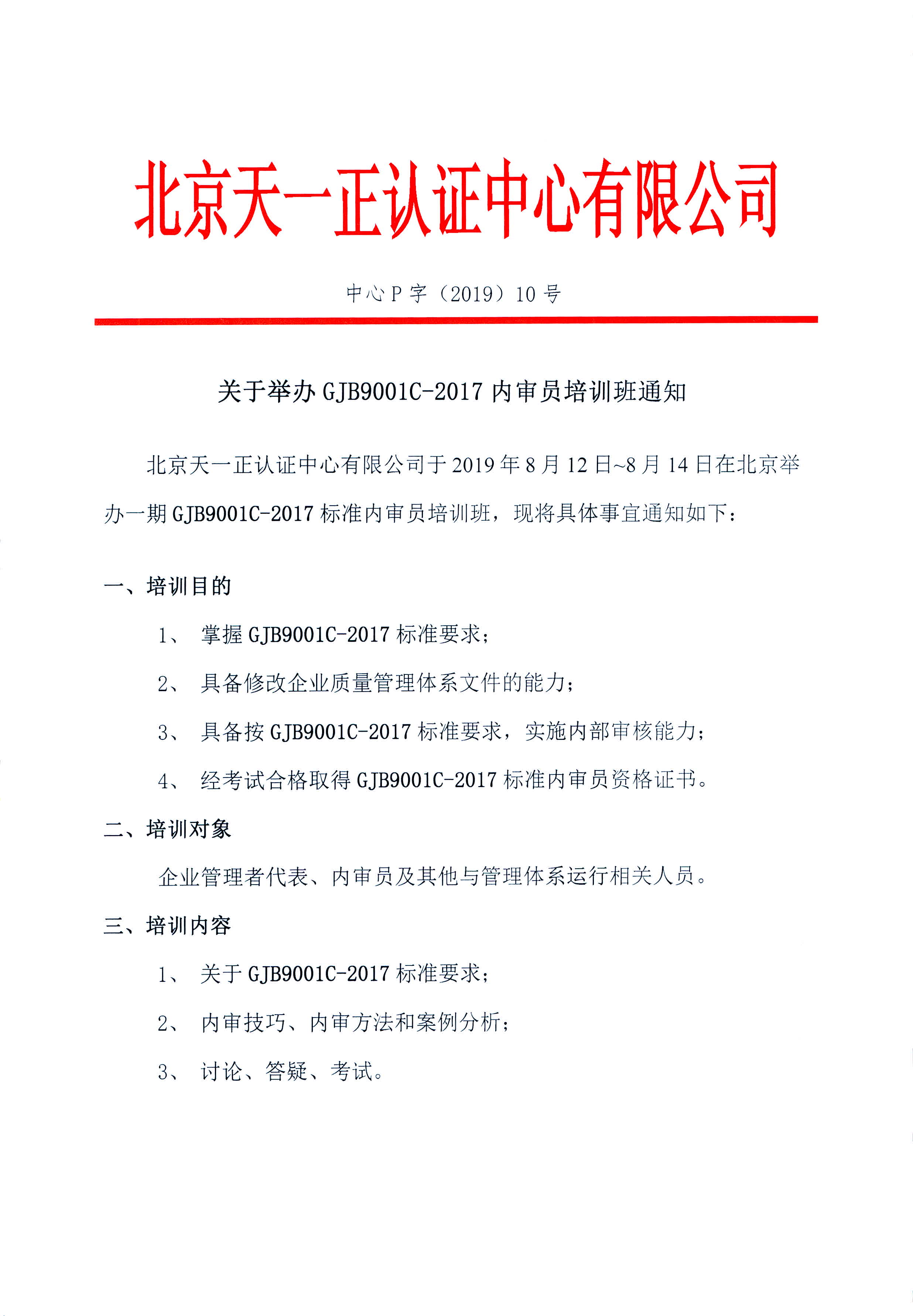 關(guān)于舉辦GJB9001C-2017內(nèi)審員培訓(xùn)班通知發(fā)表時(shí)間:2019年07月26日